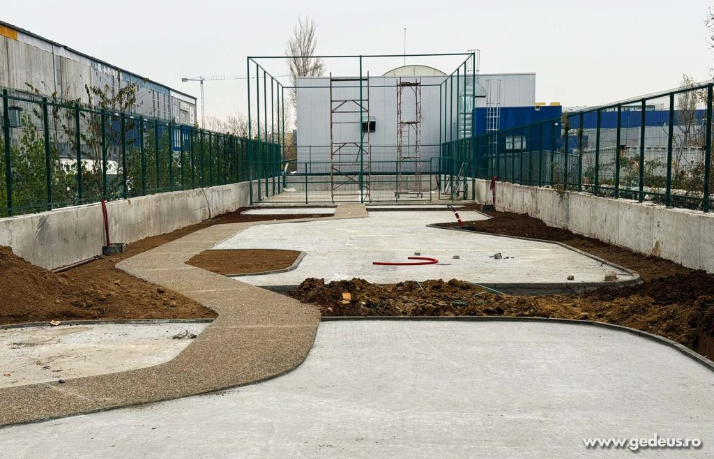 Suprafața minerală este definită de aleea din beton dezactivat, care ghidează trecătorul pe tot parcursul loculului de joacă până la terenul de sport, zona finală a acestui spațiu. Totodată, aleea este completată de suprafața din tartan, realizată în două nuanțe: verde Standard (RAL 6021 – Pale Green) și crem (RAL 1015 – Light Ivory) care conferă dinamism și pun în valoare atât echipamentele de joacă, cât și cadrul vegetal.