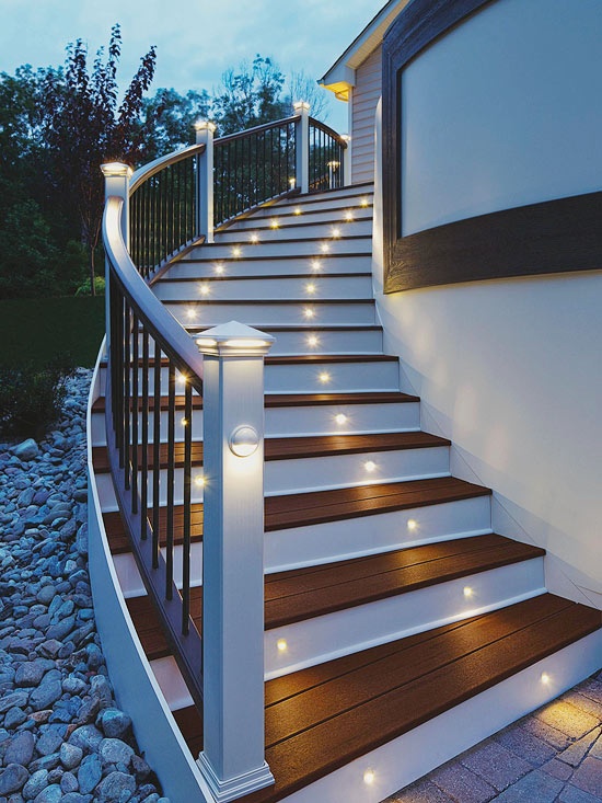 Nu este obligatoriu ca treapta si contratreapta sa fie realizate din acelasi material. Scara de fata este construita din beton. Stratul de uzura al treptei este din placi de lemn, in timp ce contratreapta a primit un finisaj din vopsea alba. Iluminatul cu Led-uri intregeste atmosfera intr-un proiect de gradina si asigura totodata siguranta utilizatorului (by Trex DeckLighting)