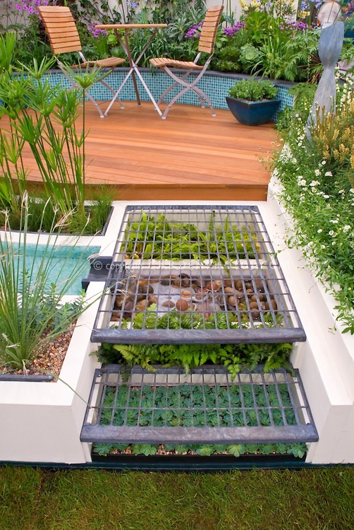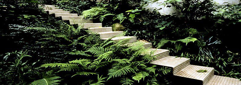 Cand spatiul este restrans, fiecare element dintr-o lucrare de amenajare a gradinii trebuie tratat in detaliu. Spatiul verde poate fi maximizat daca treptele permit plantarea sub acestea. In cazul de fata, sub grilajul metalic se dezvolta ferigi si alte plante de umbra (foto by Judy White)