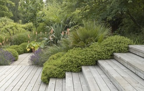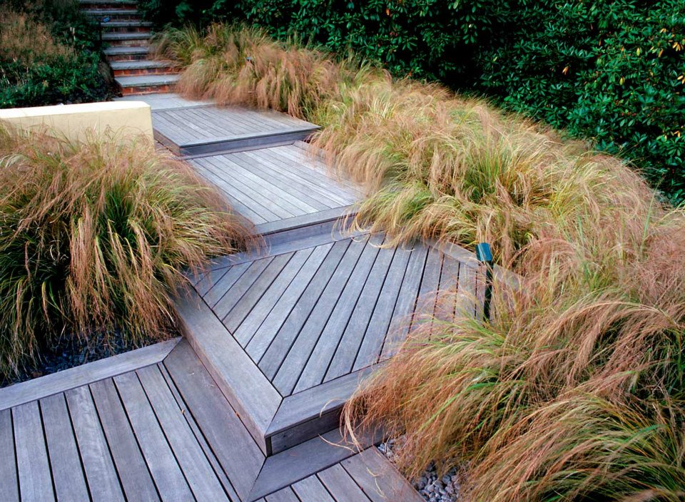 Aici observam o gradina contemporana de influenta rustica, influenta castigata prin folosirea treptelor din lemn si a gramineelor din jur (by Anthony Paul Landscape Design)